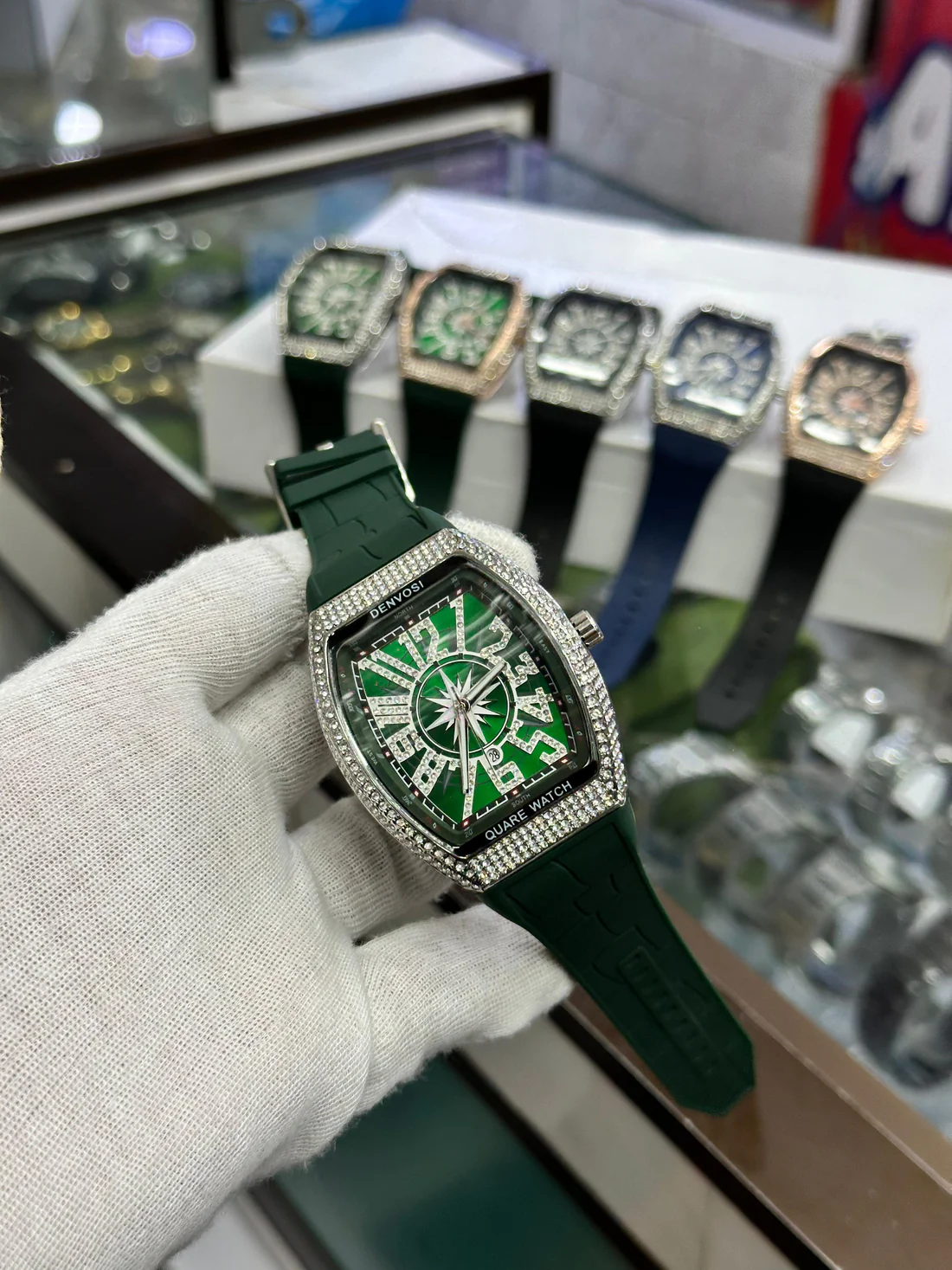 A bold and stylish timepiece featuring a sparkling diamond-studded bezel, an elegant green dial with unique geometric detailing, and a premium strap. Designed for those who love luxury with a modern edge, this watch blends sophistication and statement style seamlessly. Perfect for both formal and casual wear, it’s more than just a watch—it’s a symbol of prestige.