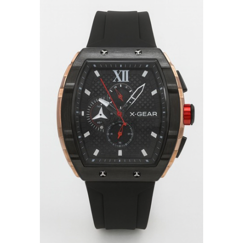 The X-Gear Luxury combines bold design with modern functionality. Featuring a unique tonneau-shaped black and rose gold case, this timepiece showcases a textured black dial with sub-dials for precision timing. The red crown accent adds a sporty touch, while the durable black silicone strap ensures comfort and long-lasting wear. A perfect fusion of style, durability, and performance for those who live life with confidence.